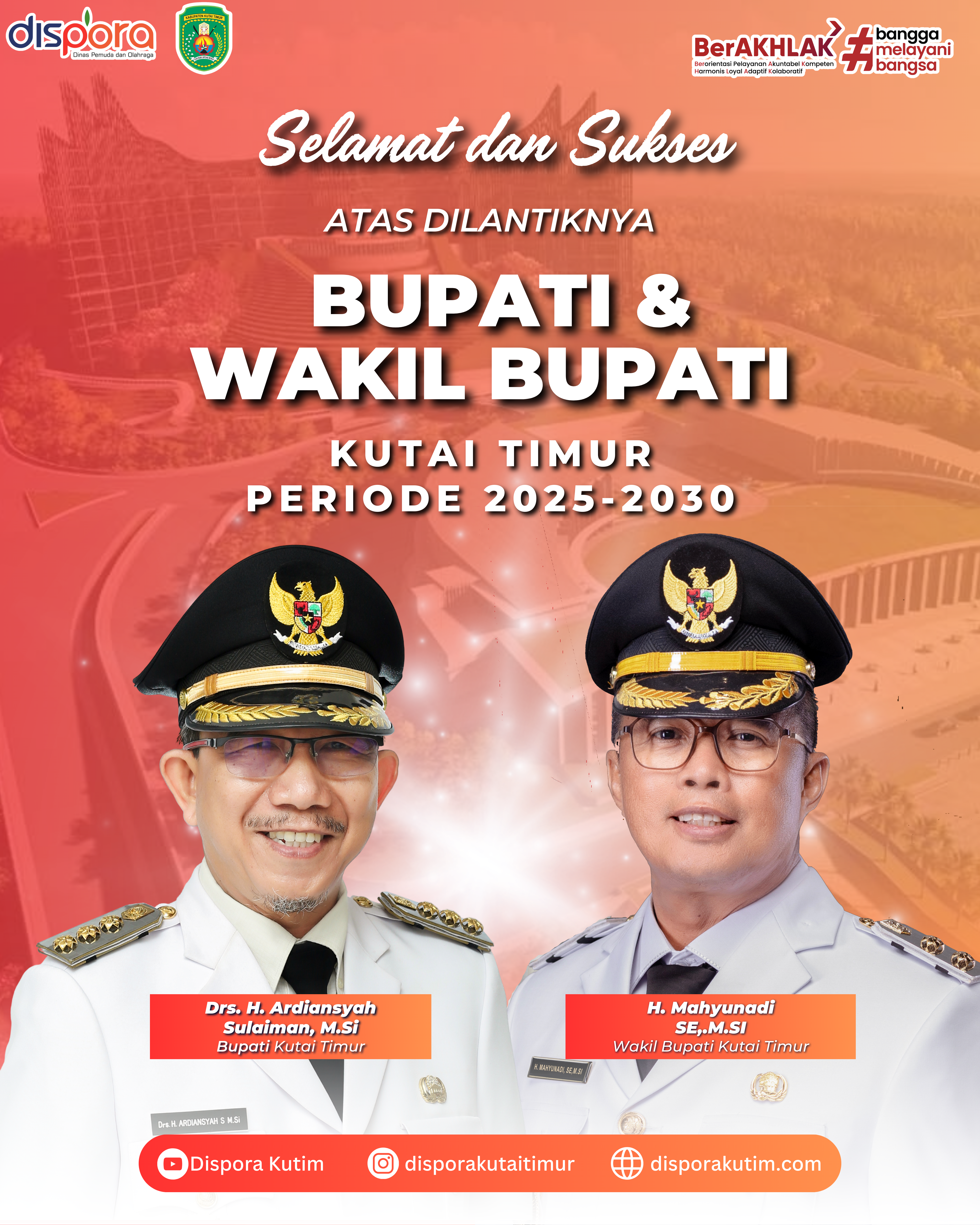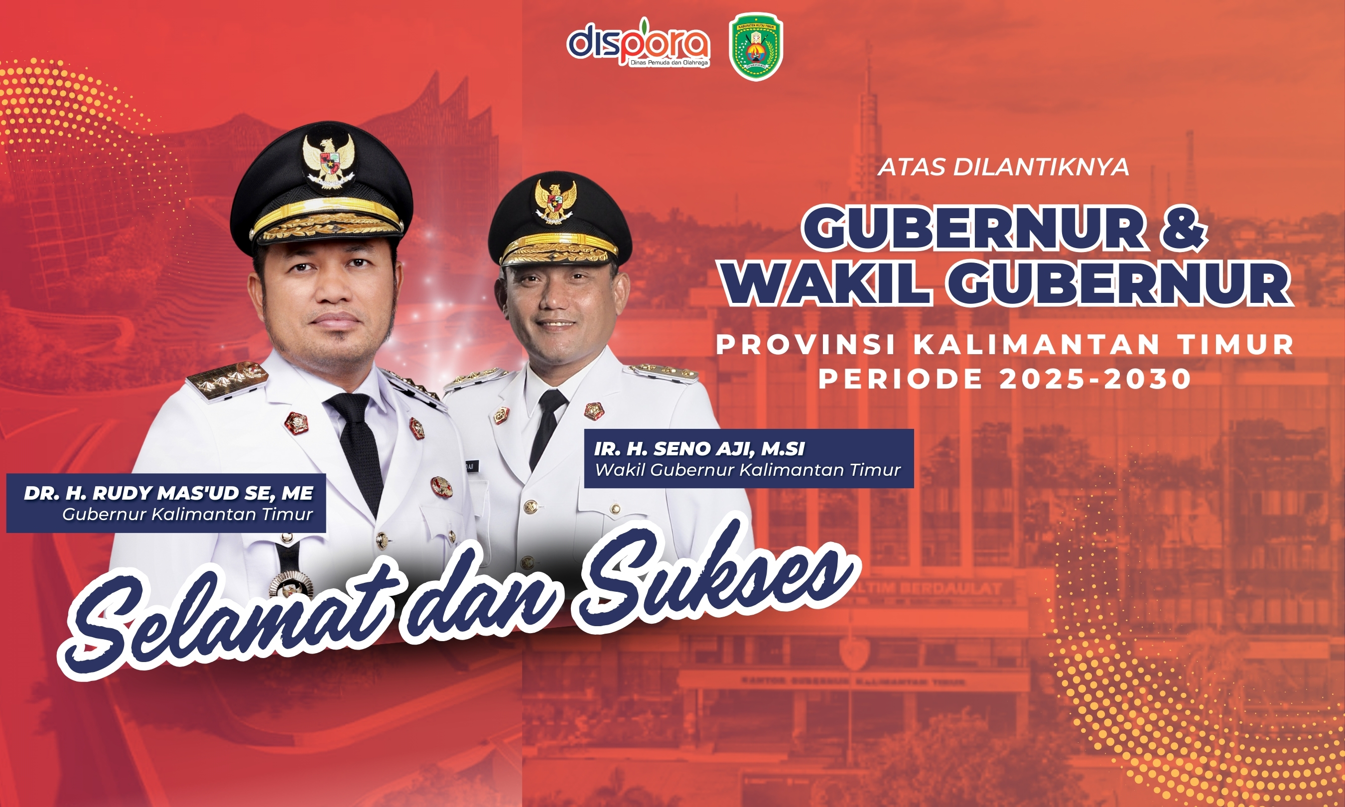 Segenap jajaran Dinas Kepemudaan dan Olahraga Kabupaten Kutai Timur mengucapkan selamat atas dilantiknya Gubernur Kaltim, Bapak Dr. H. Rudy Mas'ud SE, ME dan Wakil Gubernur Kaltim Bapak Ir. H. Seno Aji, M.Si periode 2025-2030